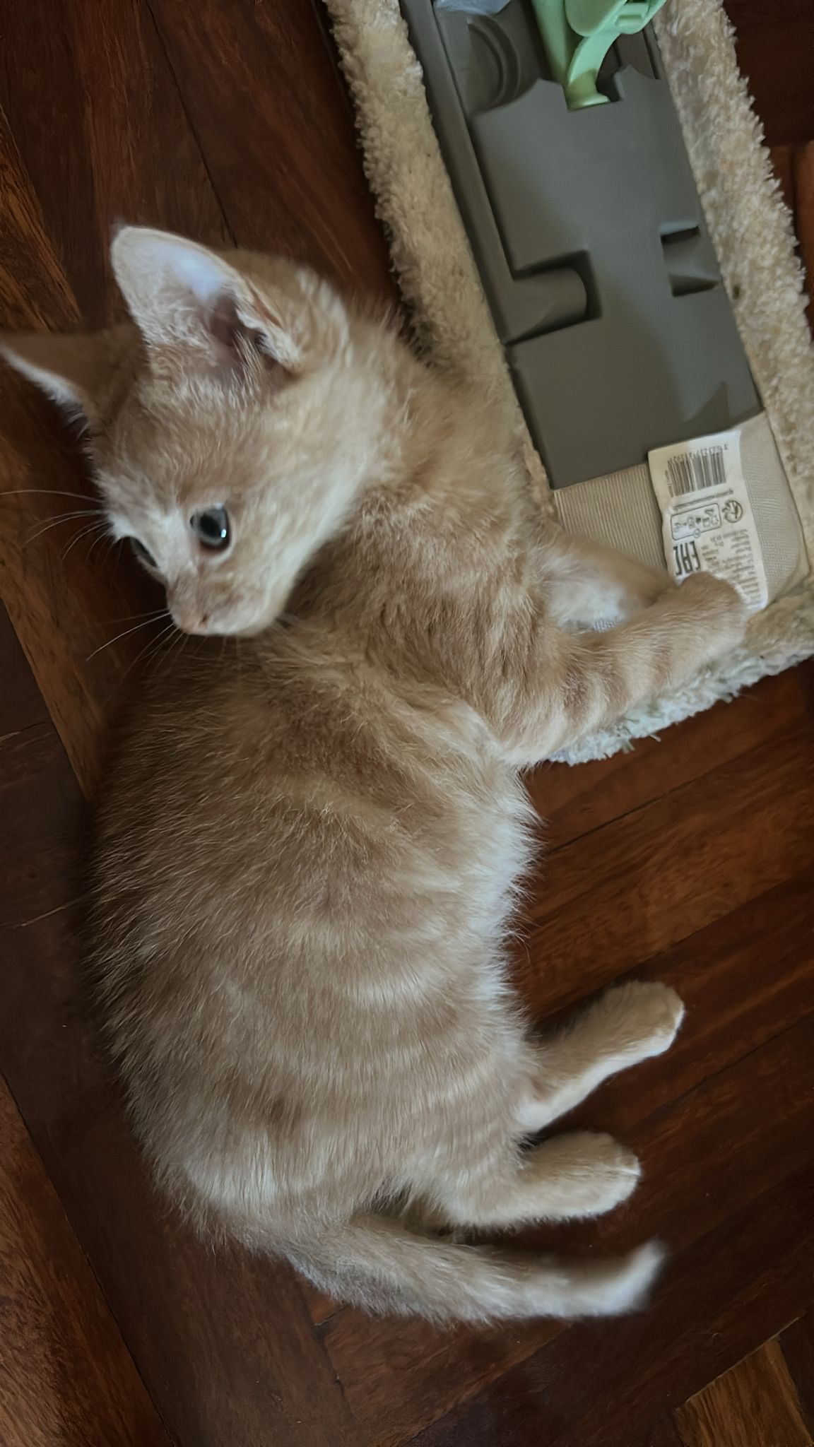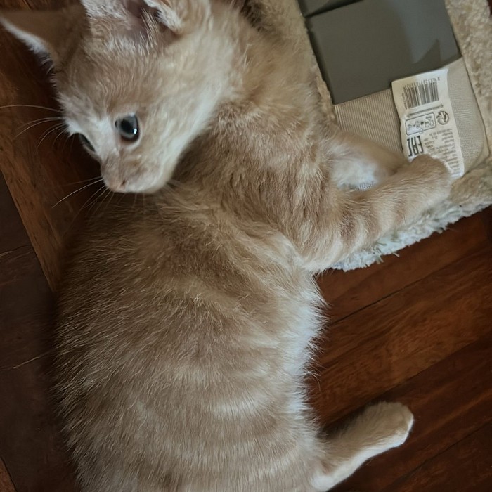 Apareció junto a sus hermanos en una caja que dejaron abandonada en un río. Está en casa de acogida y poco a poco va aprendiendo a comer pienso y a usar el arenero. Es muy pequeño pero ya reclama atención y maúlla para que lo cojas. Si quieres adoptarlo escríbenos.