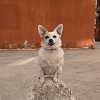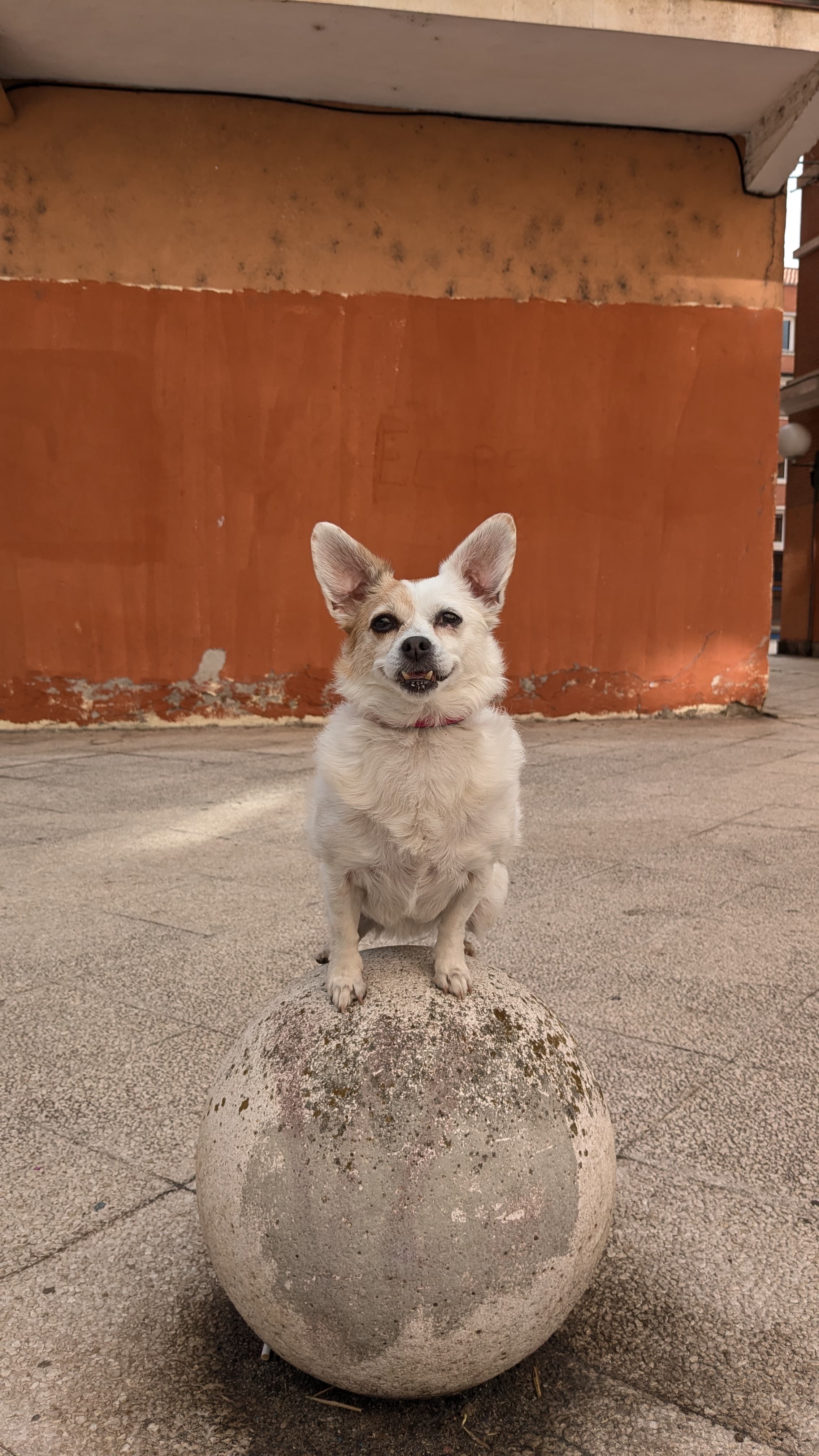 Con perros grandes, a veces se muestra insegura, aunque con los pequeños se acerca con más confianza.